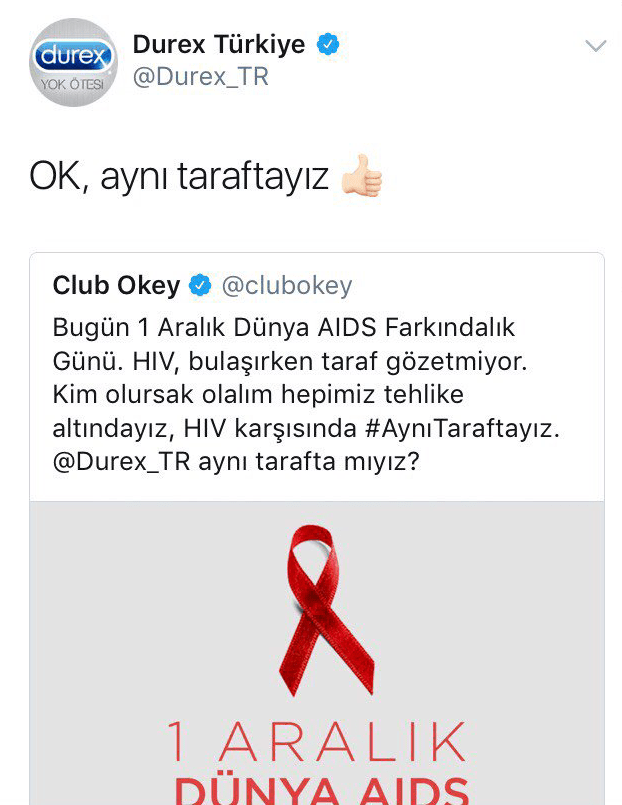 Rakip markaların birbirlerine pas attıkları kampanyaları görmek her zaman kısmet olmuyor. Prezervatif markası Okey, 1 Aralık Dünya AIDS Farkındalık Günü’nde en büyük rakibi Durex’e pas attı ve Durex’in cevabı ile farkındalık günü ayrı bir anlam kazandı. Pucca, Halil İbrahim Göker gibi internet ünlülerinin #AynıTaraftayız paylaşımları ile en popüler eğlence gruplarının paslaşma paylaşımları ile kampanya 24 saat içerisinde 2 milyondan fazla tekil erişime ulaştı. Okey ve Durex rakip olmalarına rağmen aynı tarafta yer alarak marka bilinirliklerini arttırmanın yanında AIDS farkındalığı da milyonlara erişim sağladı.